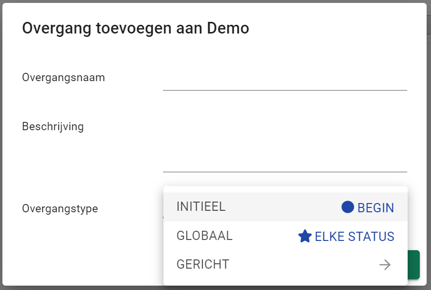 Globaal: Je kunt van elke status naar deze status toe doorgeven. Dit is de standaardovergang voor een nieuwe workflow status