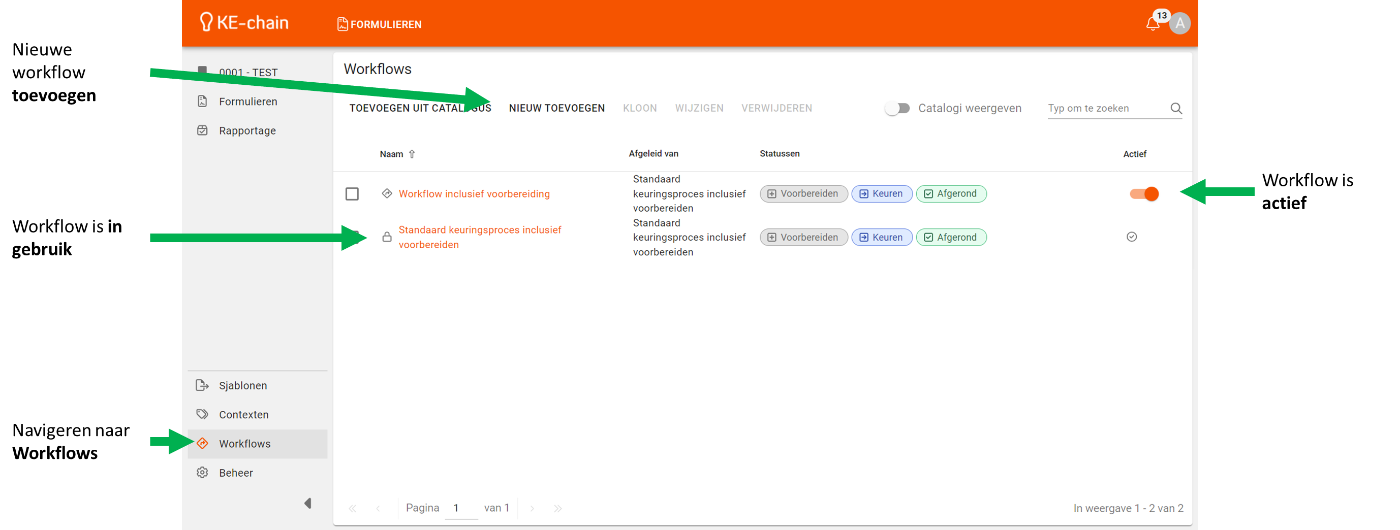 Tip: workflow statussen zijn herbruikbaar binnen de gehele KE-chain omgeving. We adviseren om dezelfde statussen her te gebruiken, zodat je hier in de toekomst makkelijk op kunt filteren of zoeken.