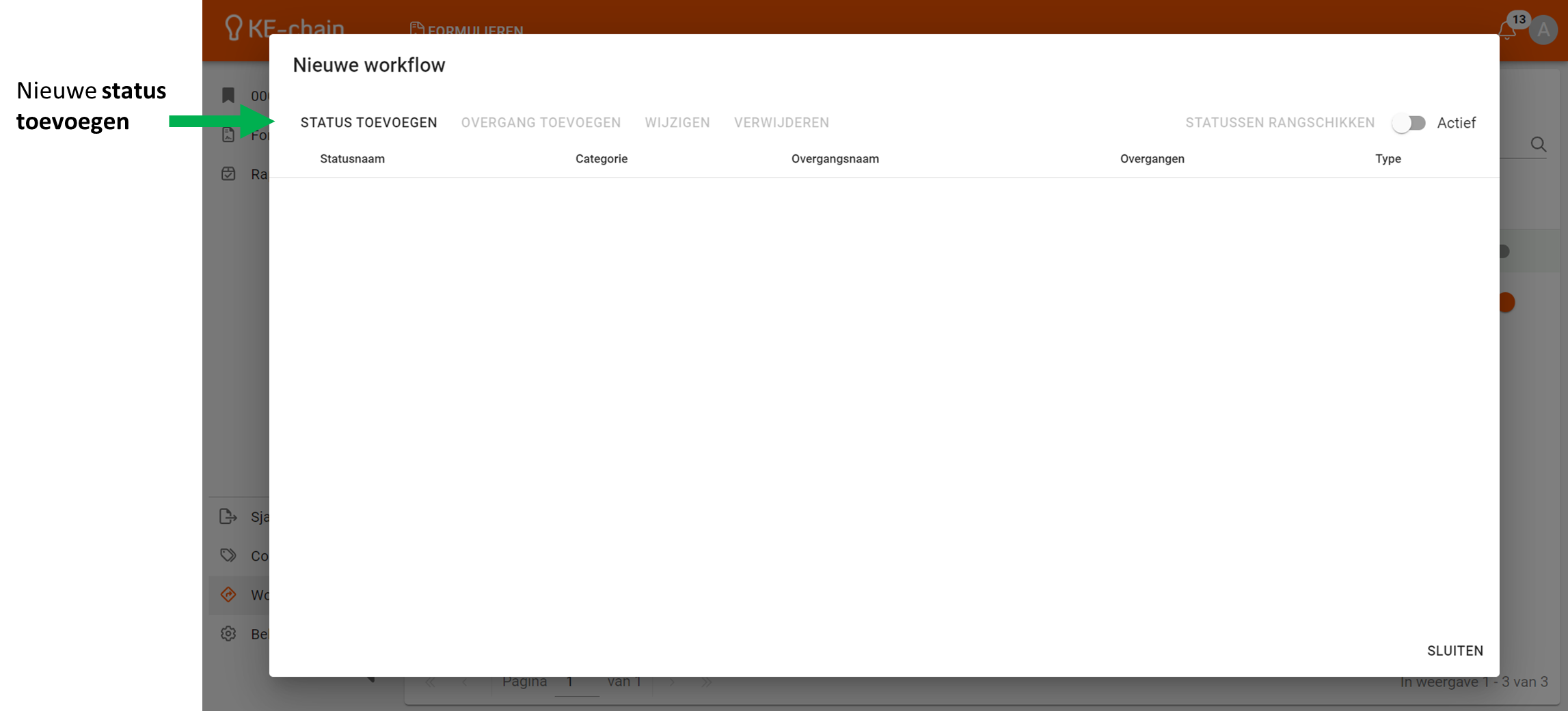 Let op: Je kunt een status verwijderen uit een workflow door de onderliggende overgangen te verwijderen. Wanneer er geen overgangen meer geconfigureerd zijn, verdwijnt de status automatisch.
