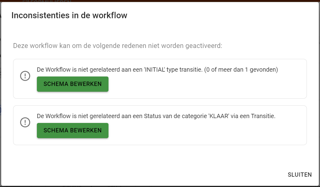 Bij het activeren van een workflow wordt automatisch gecontroleerd op inconsistenties in de workflow